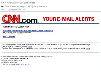Rather than stick with sensational headlines, swindlers (骗子) are now manufacturing fake custom alerts from CNN and MSNBC that looks pretty legit at first glance. The subject line, as you can see from the screenshot above, says "CNN Alerts: My Custom Alert." If you click on "Full story," you'll be taken to a video player that tells you to download Adobe Flash, but instead turns out to be malware. The easiest solution is to delete it without opening it, but MXLab's Web site has more information on dealing with this nasty bit of e-mail.