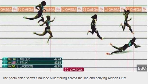 In a thrilling finish, Miller stumbled and then dived across the line as she edged out American world champion Allyson Felix to win in 49.44 seconds.