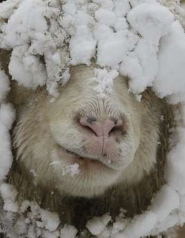 A snow-covered sheep stands on a meadow (草地,牧场) during snowfalls near the Albispass mountain pass south of Zurich November 22, 2008.