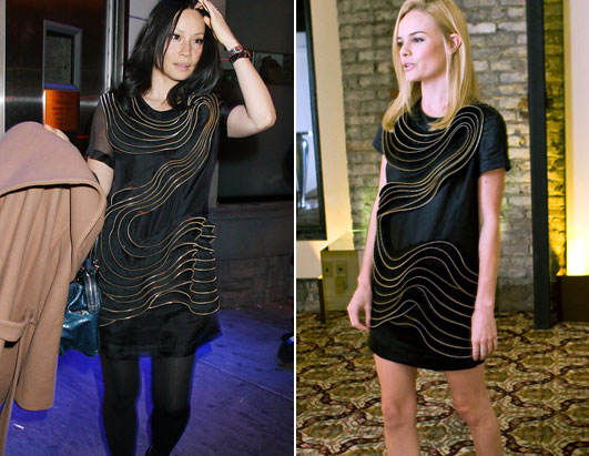 Both Lucy Liu and Kate Botsworth wore this gold and black Philip Lim minidress, but who rocked it the best? Liu paired the dress with black tights and platform Mary Jane's at stylist Patricia Field's birthday party Feb. 15, 2009, while Botsworth showed off her bare legs at the Global Green Benefit in December 2008.