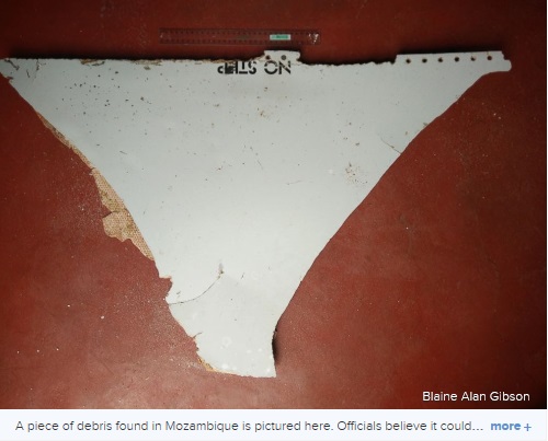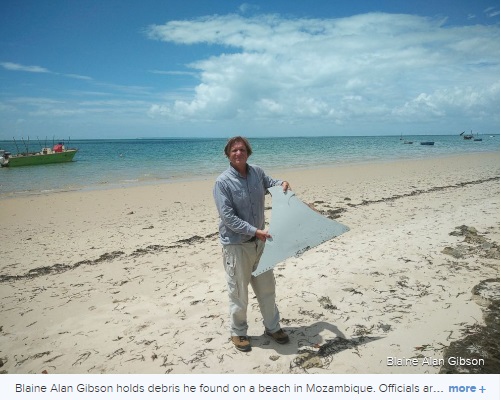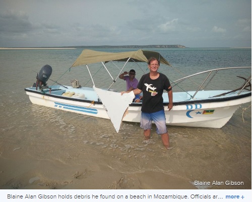 According to a Mozambique aviation official, an American named Blaine Alan Gibson walking along the beach over the weekend in Mozambique found the piece of debris near Benguerra.