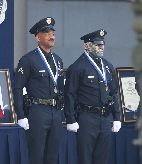 Will Smith and Joel Edgerton are dressed as cops on "Bright" in Los Angeles. They are given a medal by the mayor in Los Angeles, California, Nov. 6, 2016.