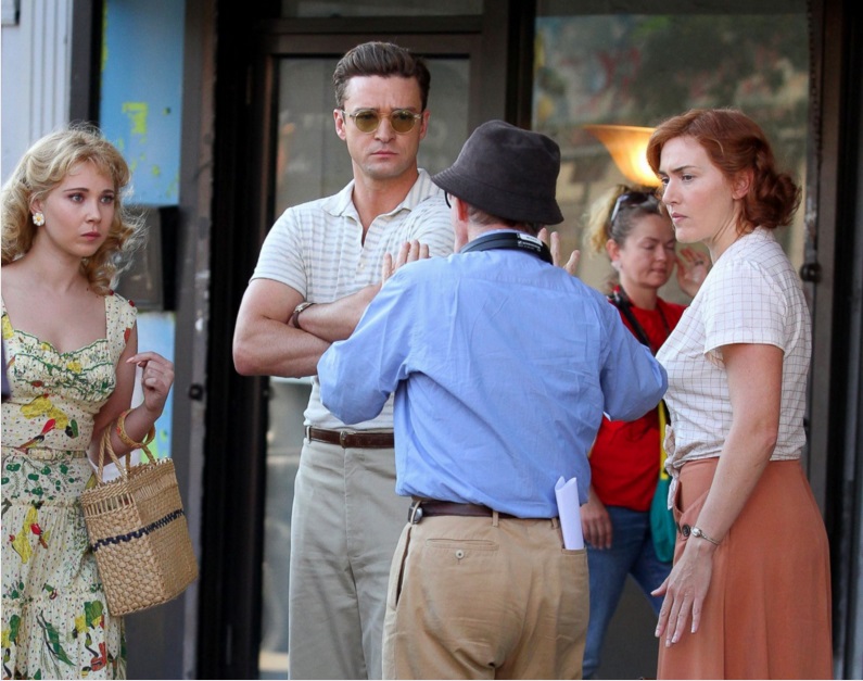 Juno Temple, Justin Timberlake and Kate Winslet, with director Woody Allen, between takes for his new film, set in the 1950s in the Richmond Hill neighborhood in Queens in New York City, Oct. 18, 2016.