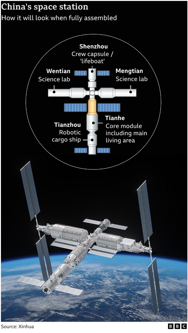 Last year, China put into orbit the first module of its Tiangong or "Heavenly Palace" space station. It plans to add more modules, such as Mengtian science lab, by the end of the year.