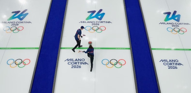Great Britain's Bruce Mouat and Jennifer Dodds compete during a curling mixed doubles match against Norway at the Milano Cortina 2026 Winter Olympic Games in Cortina d'Ampezzo, Italy, Feb. 4, 2026.